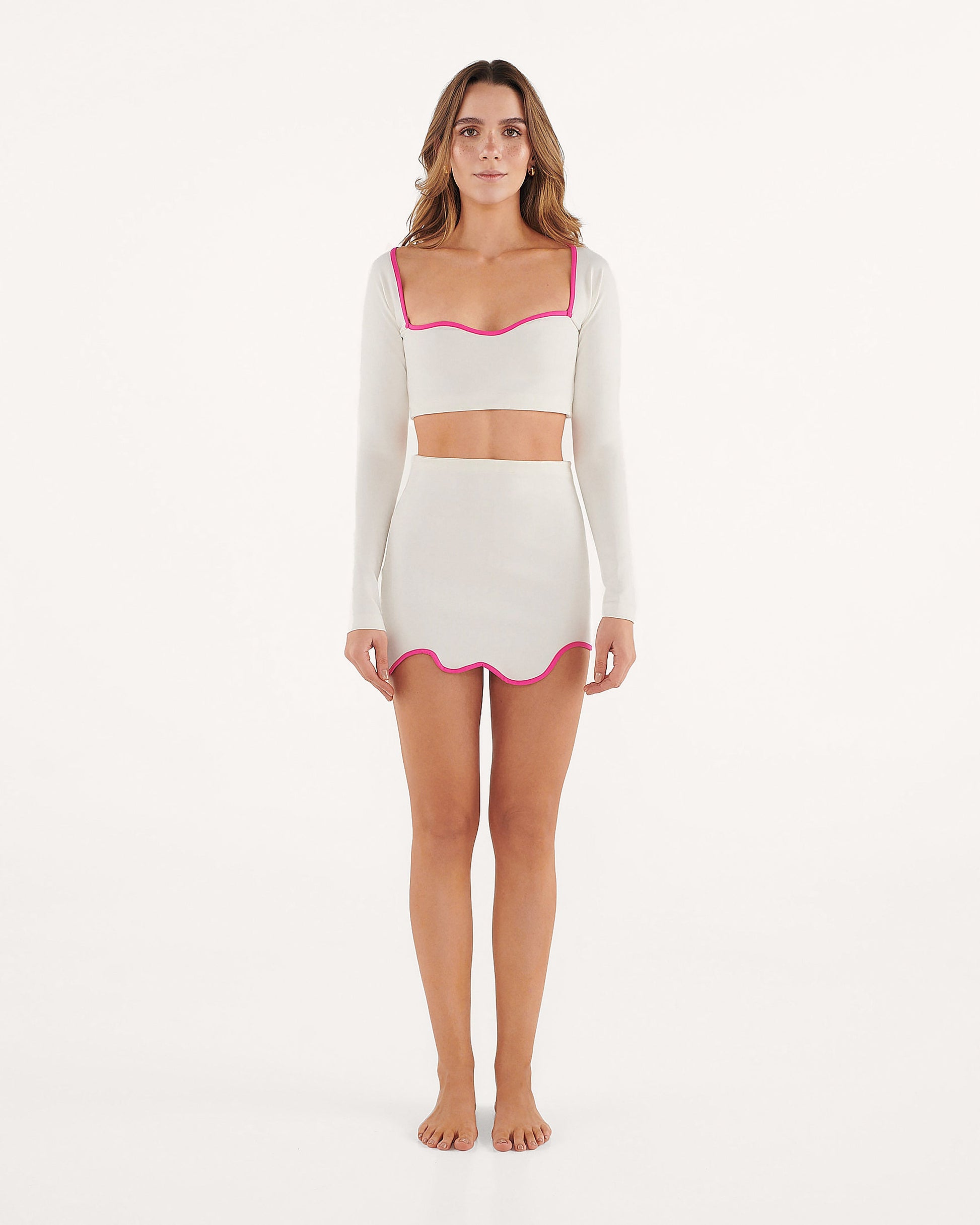 Confeccionado en jersey. Tiene una silueta ajustada y un escote sin tirantes, detallado con un ribete en contraste de color fucsia.